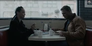 Without any difficulty, Reacher tracks down Neagley in a Diner in the Bronx. Neagley relays information about her findings to Reacher who is shocked to learn that Calvin was married and had a family. After handing Reacher crime scene photos, he deduces from his injuries that Calvin was tortured and then had his legs broken with an iron bar and thrown from a helicopter. Presuming that Calvin had asked the unit's help, Reacher is surprised to learn that Neagley has not been able to contact any other members of the unit. One of the members, Stan Lowrey had been killed previously by a drunk driver, and Reacher seems depresed that so much has happened since he has been wandering around the U.S. Reacher tries to blame Neagley for not informing him of all these occurances, but she deflects by telling him that even if he had known about the events, he would not have come to which he acknowledges. They decide to investigate Calvin's case and not leave it to the hands of police and heads to visit his widow. As the pair leave the diner, they are unknowingly watched by two mysterious individuals.